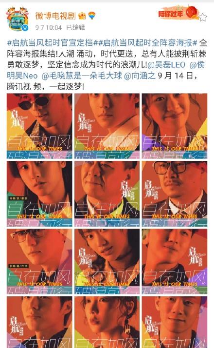 由吴磊、侯明昊、毛晓慧、向涵之等主演的时代电视剧《启航:当风起时》定档在9月14日,在腾讯视频全网独播,首次更新在周二、三、四的20点更新2集,次周起每周一、二、三更新!